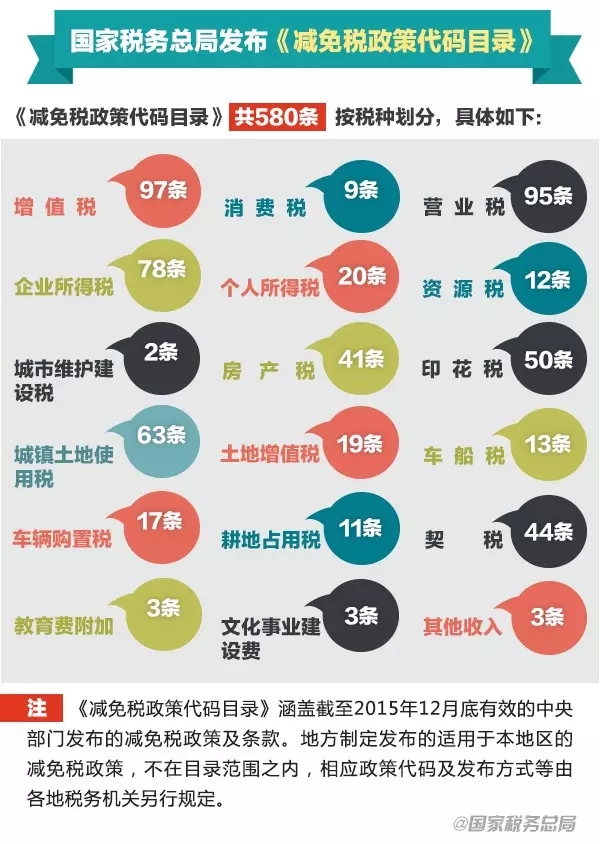 新版《減免稅政策代碼目錄》(以下簡稱《代碼目錄》)包括580條,涉及增值稅、消費(fèi)稅、營業(yè)稅、企業(yè)所得稅、個人所得稅、資源稅、房產(chǎn)稅、城市維護(hù)建設(shè)稅、印花稅、契稅、城鎮(zhèn)土地使用稅、土地增值稅、車船稅、車輛購置稅、耕地占用稅、教育費(fèi)附加和文化事業(yè)建設(shè)費(fèi)等。