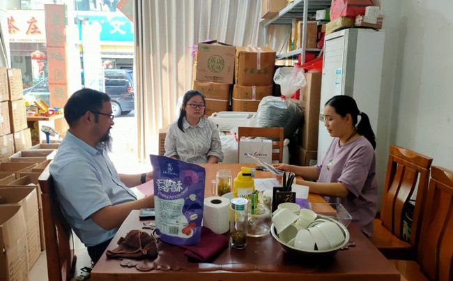 [上圖為胡曉紅副經(jīng)理與會計方智敏在與黃山市歙縣仰坦精制花茶廠經(jīng)理江健進行面對面溝通交流。]
