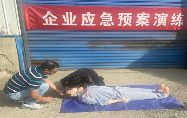 觸電急救專項(xiàng)處置方案演練中,通過人體模型教會員工心肺復(fù)蘇的辦法,并模擬員工觸電受傷場面,撥打120急救電話,同時企業(yè)救護(hù)組成員對休克的員工進(jìn)行心肺復(fù)蘇,通過及時有效的急救,在救護(hù)車來到前幫助受傷人員恢復(fù)自主呼吸,從而挽救受傷員工的生命。