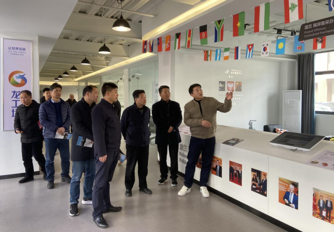 衢州市有關領導首先參觀了大龍網集團旗下的歙縣龍工場,歙縣大龍網區域負責人江笑平向到訪領導介紹了龍工場的基本情況、運營模式及優勢背景;并對園區供應鏈融資服務平臺、電商直播中心、運營中心、共享會議室、洽談區等多個模塊運營流程及整體情況進行了詳細講解。通過江總的介紹,衢州市領導對歙縣龍工場有了清楚的認知,并對大龍網運用數字貿易推動黃山眾多實體企業走出國門、走向世界的成功做法和發展前景表示贊賞。