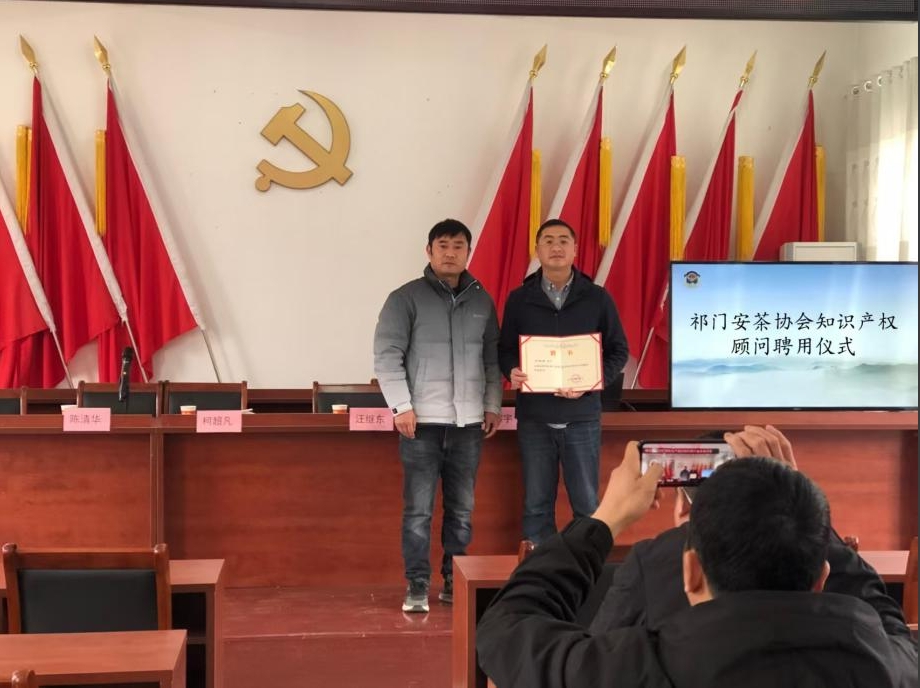 在聘任儀式上,徽明知識產權代理所負責人與安茶協會代表合影留念,共同見證了這一重要時刻。安茶作為祁門縣的傳統名茶,已入選《大黃山地理標志保護名錄》,此次合作將進一步推動安茶品牌的知識產權保護與發展。